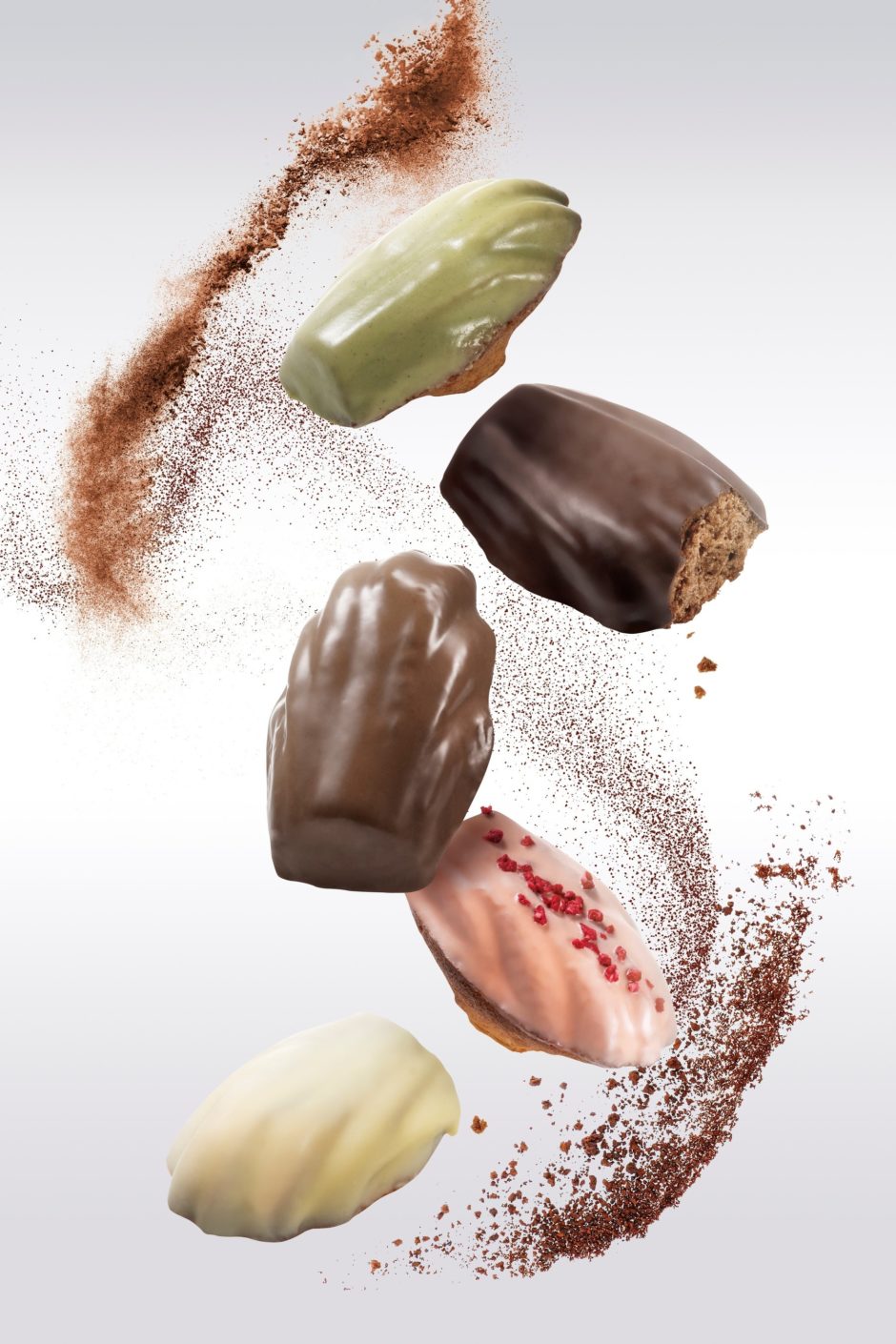 - マドレーヌはヘーゼルナッツのジャンドゥーヤやピスタチオ、ラズベリーなど5種のフレーバーを展開。コーティングやペーストでチョコレートの個性を引き出しています。