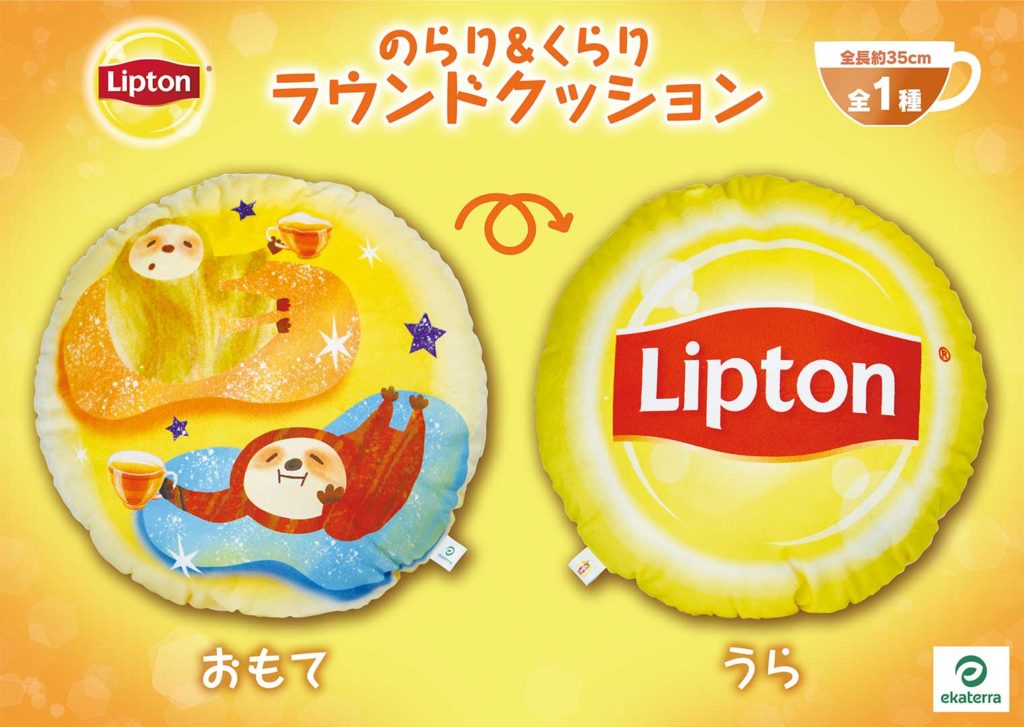 表にはのらり&くらりのイラスト、裏にはリプトンロゴがプリントされたラウンドクッションです。サイズは直径約35㎝、素材はポリエステル等です。